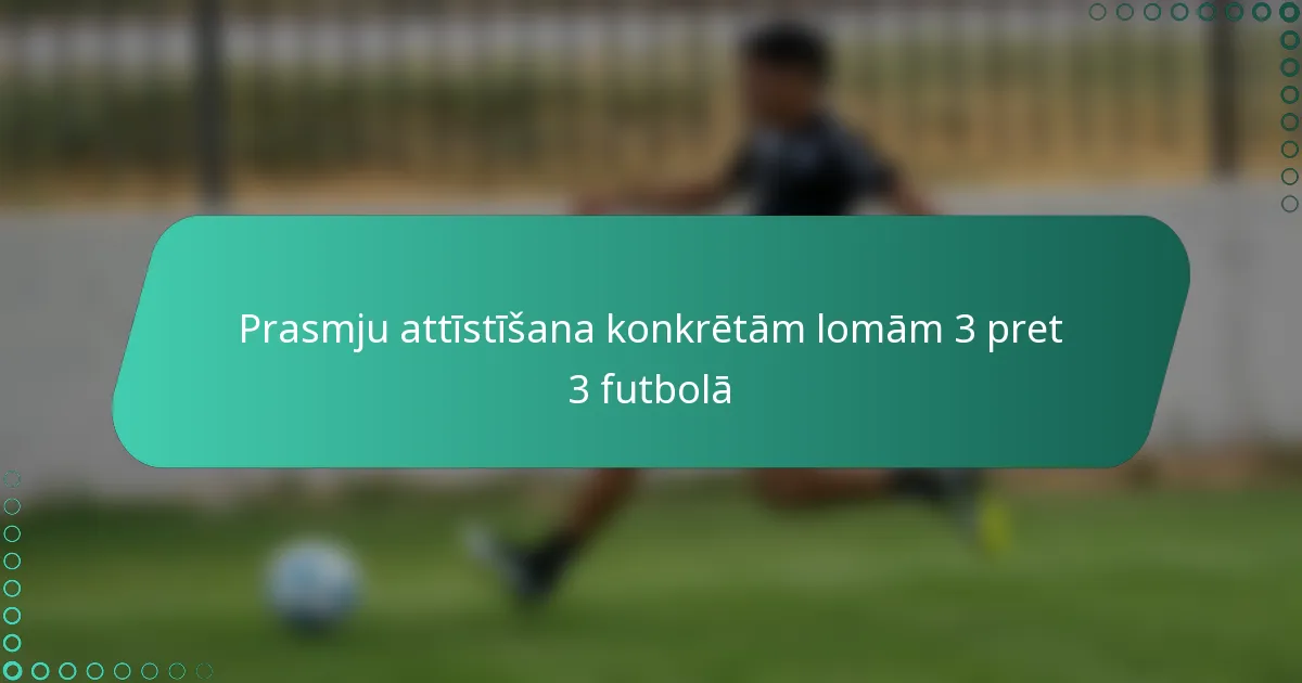Specifisku prasmju attīstīšana katrai lomai 3 pret 3 futbolā ir būtiska, lai maksimizētu komandas sniegumu. Aizsargiem jākoncentrējas uz pozicionēšanu un komunikāciju, kamēr pussargiem jāuzlabo bumbas kontrole un spēles inteliģence. Uzbrucējiem jāpilnveido savas pabeigšanas un kustību stratēģijas, lai efektīvi piedalītos gan uzbrukumā, gan aizsardzībā.
