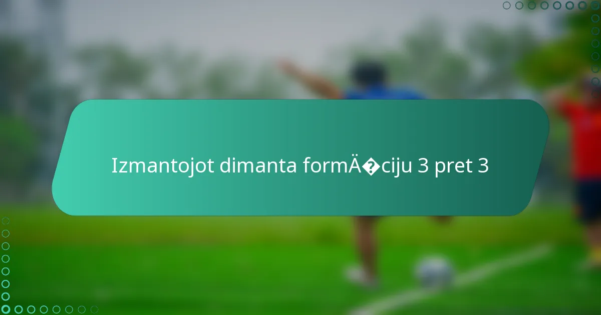 Dimanta formācija trīs pret trīs futbolā ir taktiska izkārtojuma veids, kas spēlētājus novieto dimanta formā, uzlabojot gan uzbrukuma, gan aizsardzības stratēģijas. Ar vienu spēlētāju aizmugurē, diviem viduslaikā un vienu uzbrucēju, šī formācija veicina plūstošu kustību un efektīvu atbalstu visā laukumā, ļaujot komandām saglabāt bumbu un pielāgoties dažādām spēles situācijām.